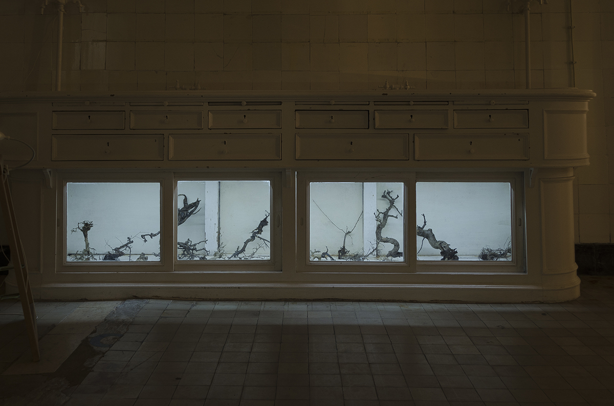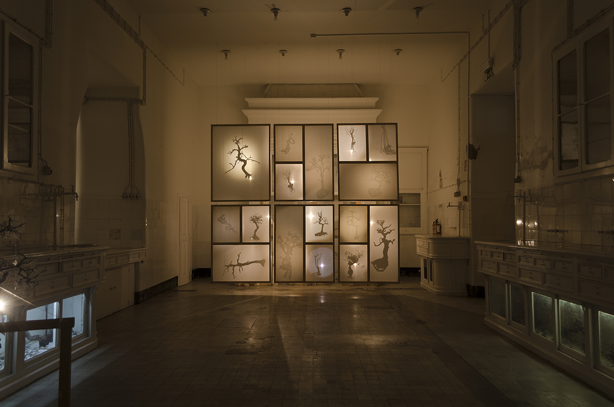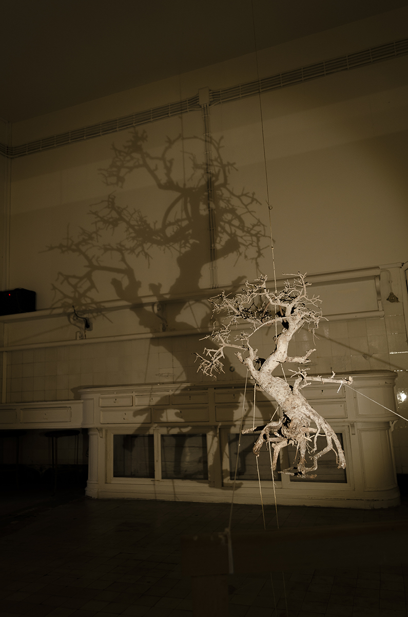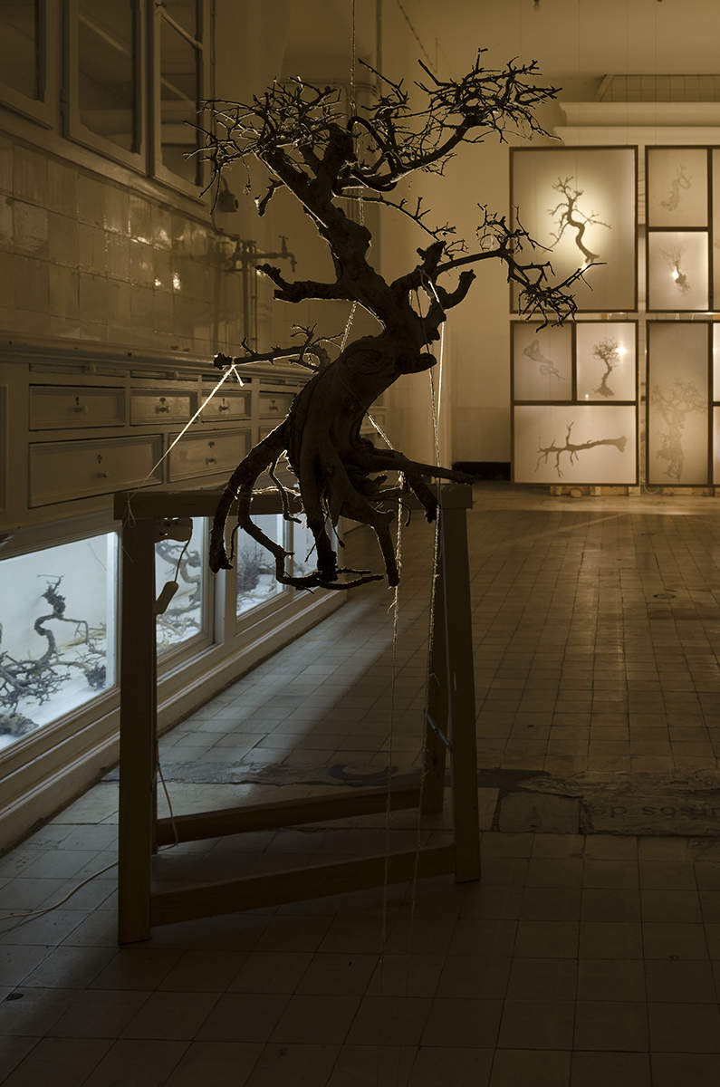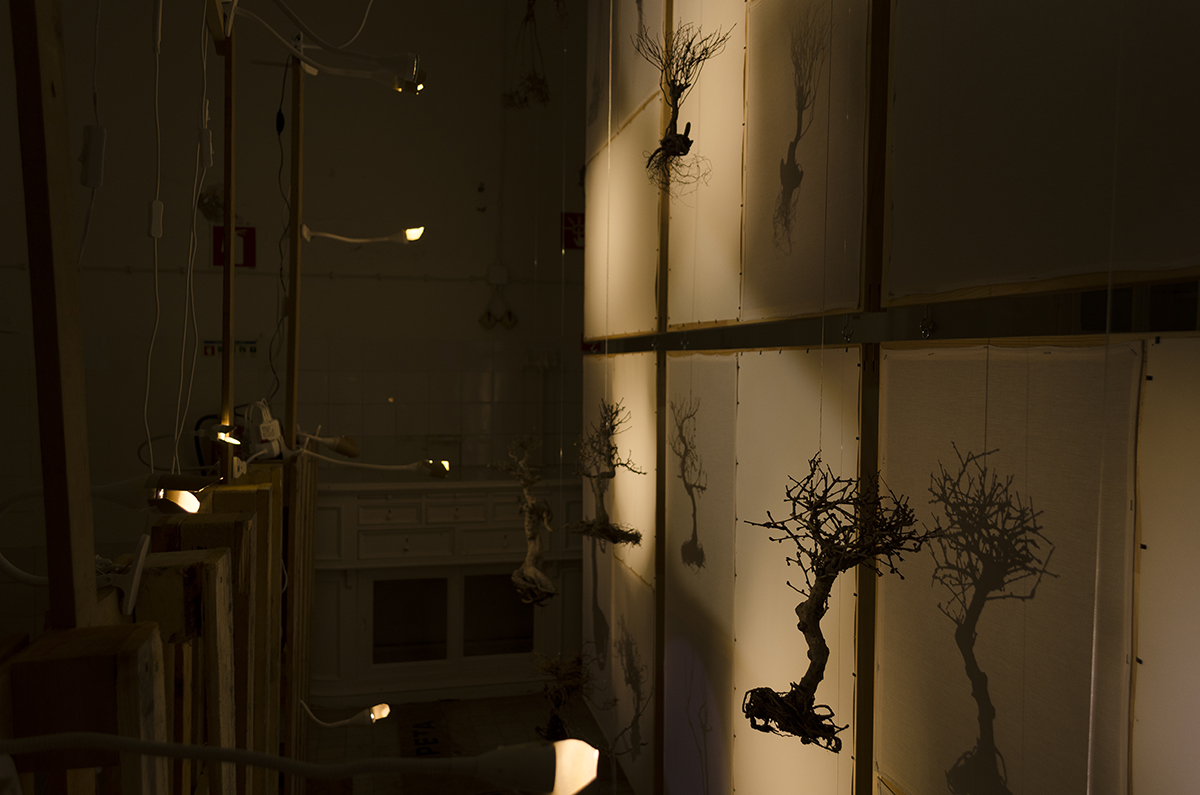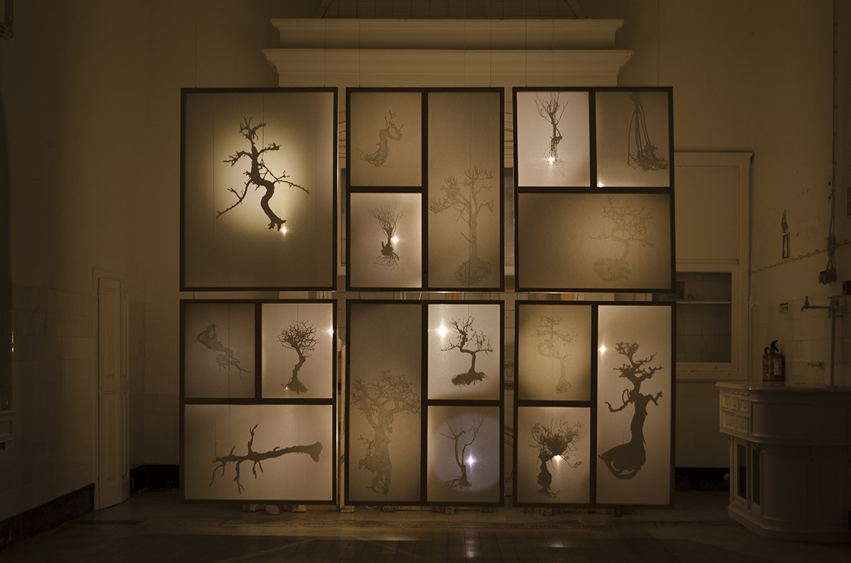 Read More(…)A exposição é constituída por três instalações; a instalação PARADEISOS, formada por 6 desenhos e sombras de bonsais que criam desenhos com o seu próprio movimento autónomo; a instalação sonora, AURORA #01, composta por sons da natureza captados e editados pelo artista. É uma forma metafórica e distópica de trazer vida para dentro do museu. O ambiente bucólico gerado, contrasta com a morte anunciada pela presença massiva de bonsais sem vida e segundo Henrique Vieira Ribeiro, “cruza-se com a sensação de renovação de ciclo – de vida – introduzida pelo registo do som de um dia que (re)nasce.”(…) Em oposição espacial temos a instalação, CADÁVER #031, uma sombra projetada na parede de um bonsai. Citando Henrique Vieira Ribeiro, “o bonsai é uma árvore totalmente criada pelo Homem, todo o seu crescimento e desenvolvimento é uma pegada iluminista que se mantém.” (…)